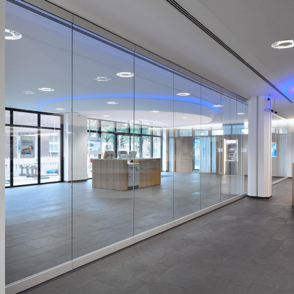So sind unsere verfahrbaren Glastrennwände vielfältig einsetzbar und finden sich zum Beispiel häufig in Banken zur Trennung der SB-Zone zum Beratungsbereich, in Konferenzzonen zur Besucherlenkung, oder in Büroflächen zur flexiblen Raumzonierung.