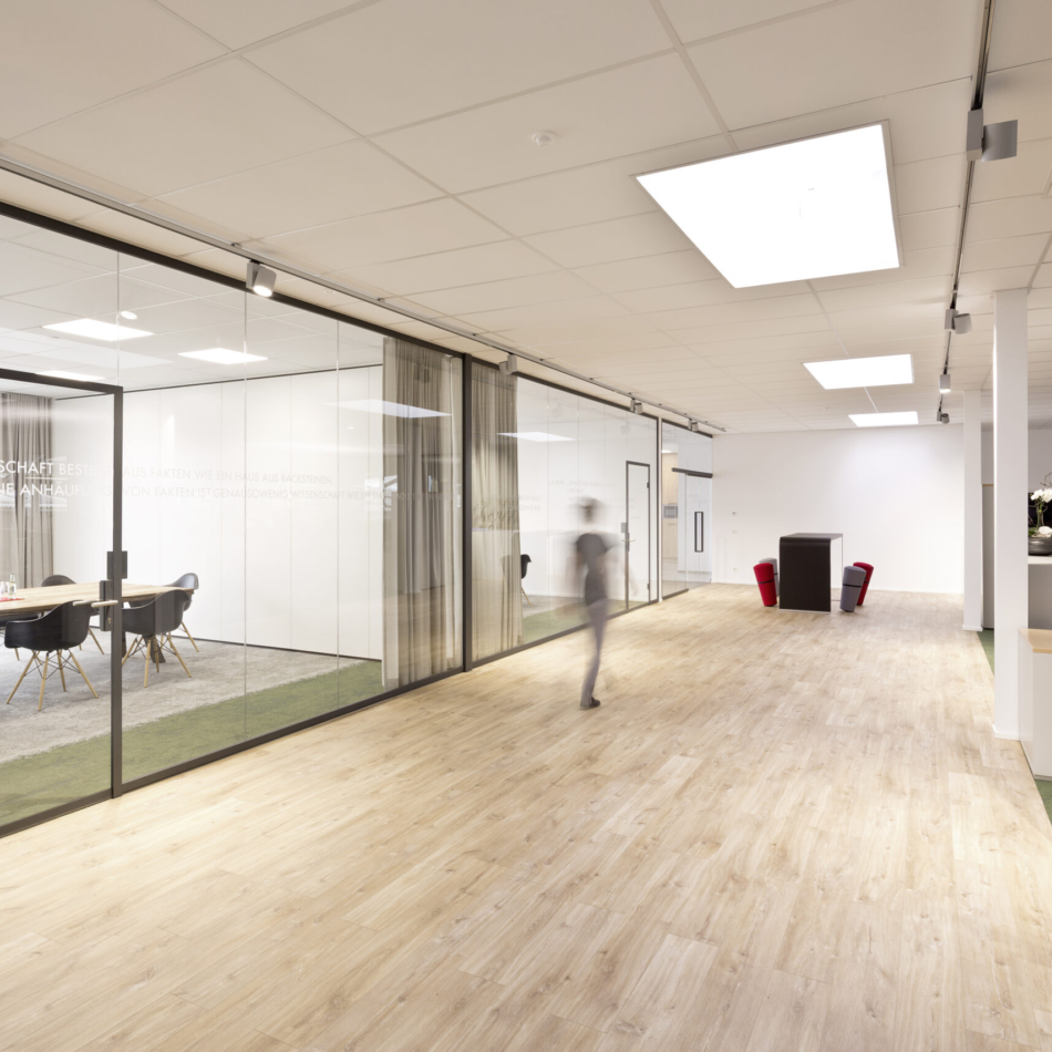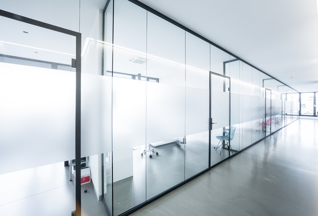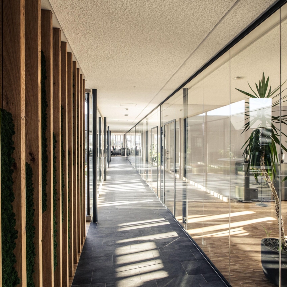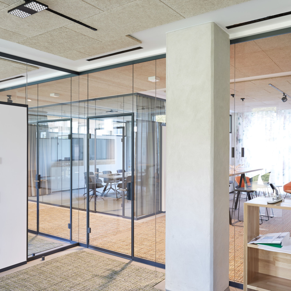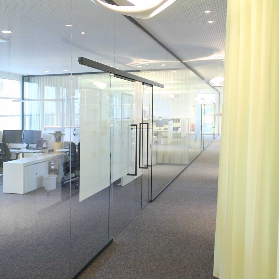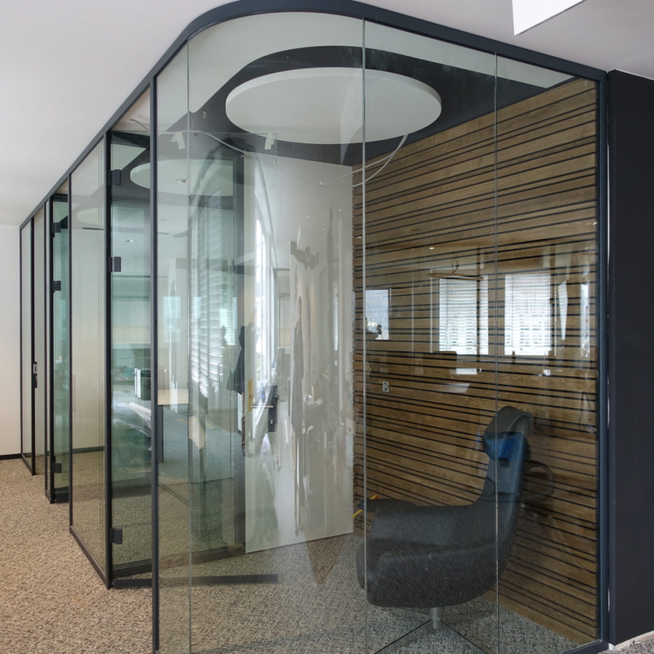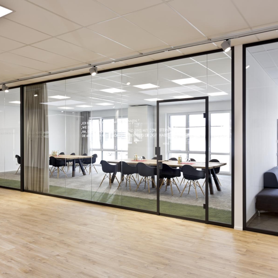 Vollverglaste Flurtrennwände in Besprechungs- oder Büroräumen mit normaler bis mittlerer Schalldämmanforderung.