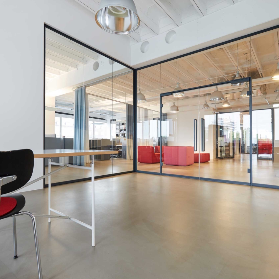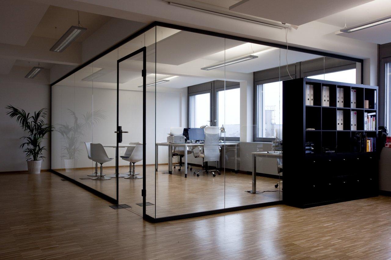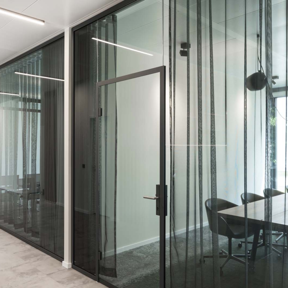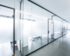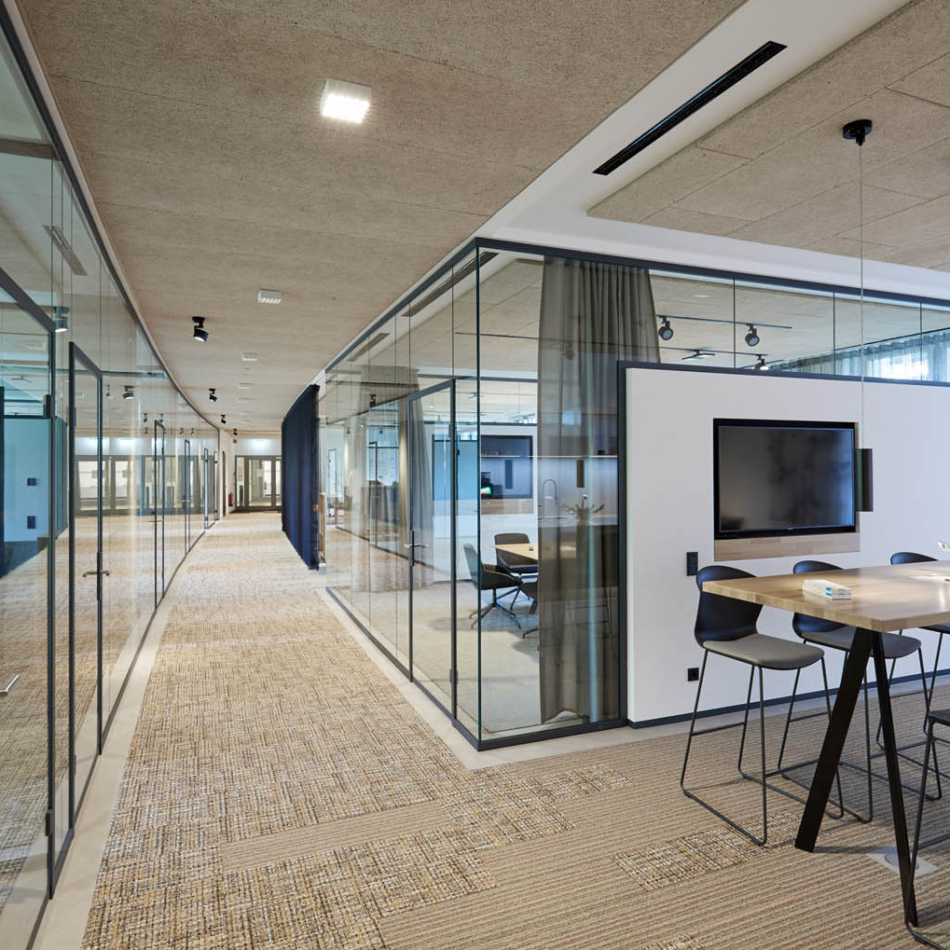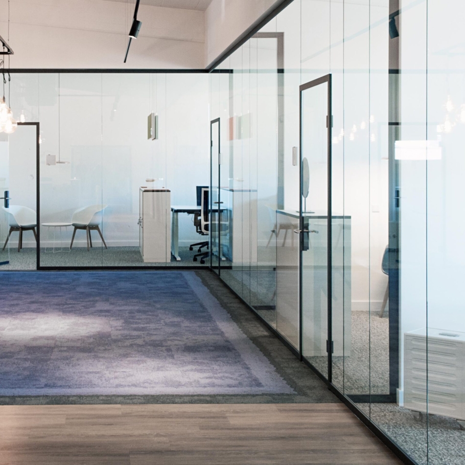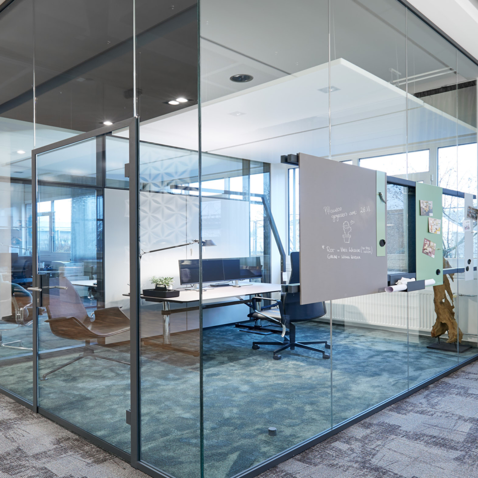 Vollverglaste Flurtrennwände in Besprechungs- oder Büroräumen mit normaler bis mittlerer Schalldämmanforderung.