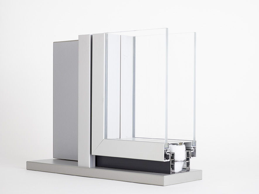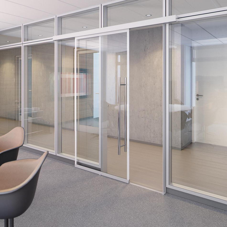 Der S80 Glasrahmentyp small-line zeichnet sich durch seine Harmonie mit der Spiegelbreite der Türzargen aus und bietet darüber hinaus an jedem Elementstoß eine ausgezeichnete Anschlussmöglichkeit für einen T-Anschluss für Zwischenwände. Die nahezu flächenbündig zum Glasrahmen liegende Verglasung kann in der Stärke 6-12,76 mm ausgeführt werden und erreicht eine Schalldämmung von 42 dB bis maximal 54 dB RwP.