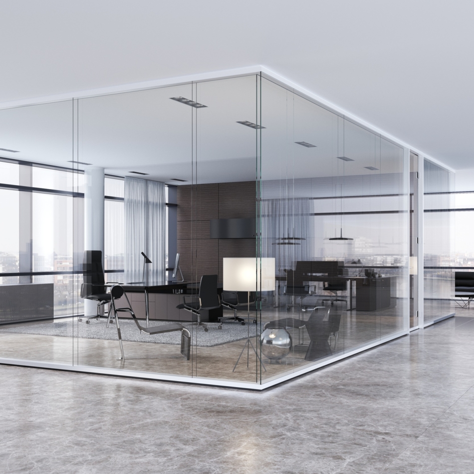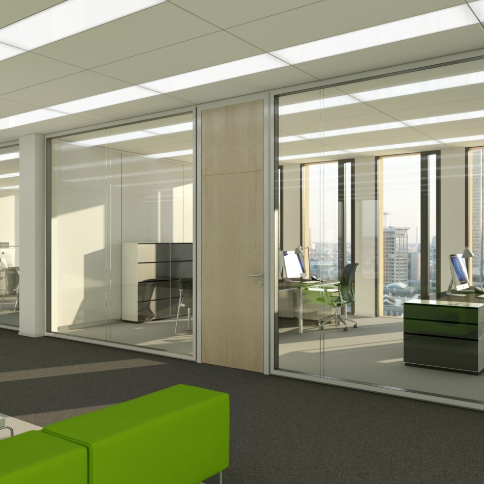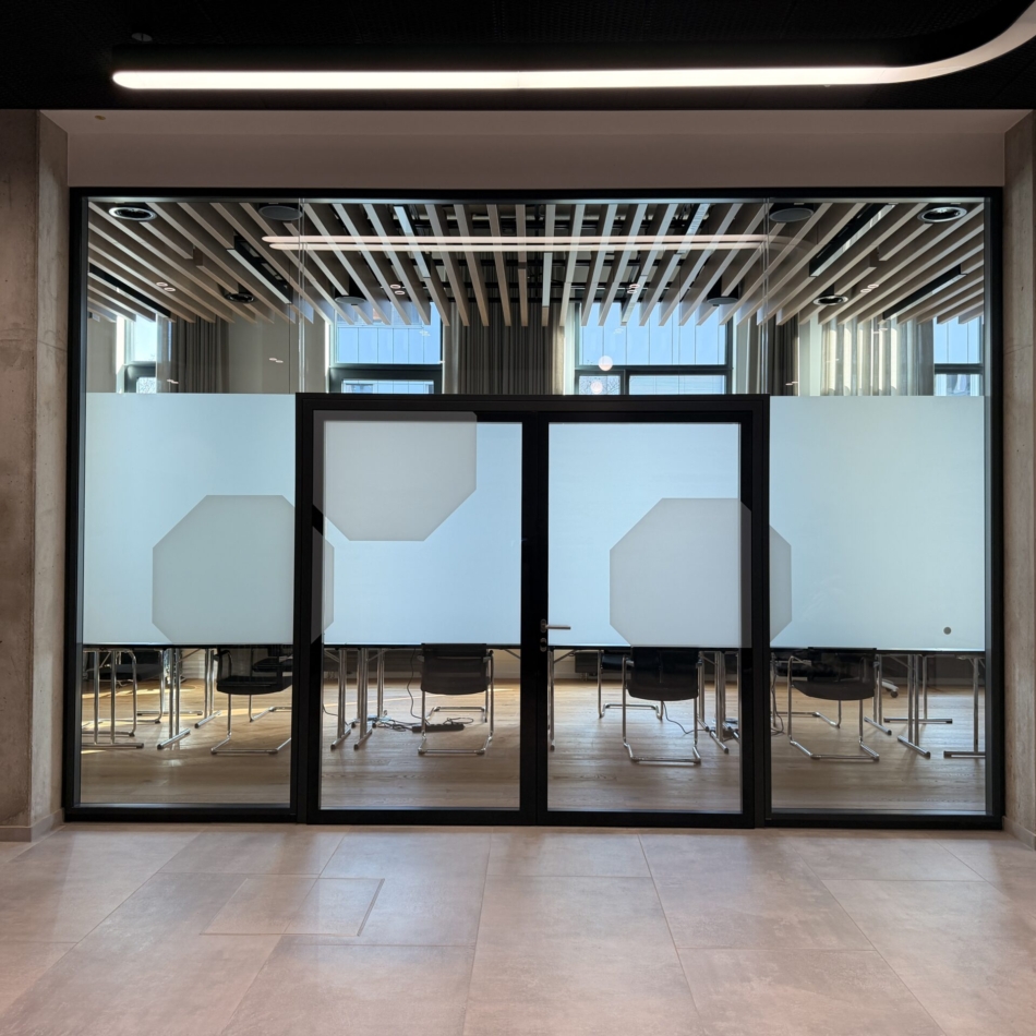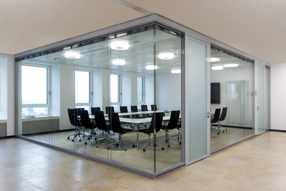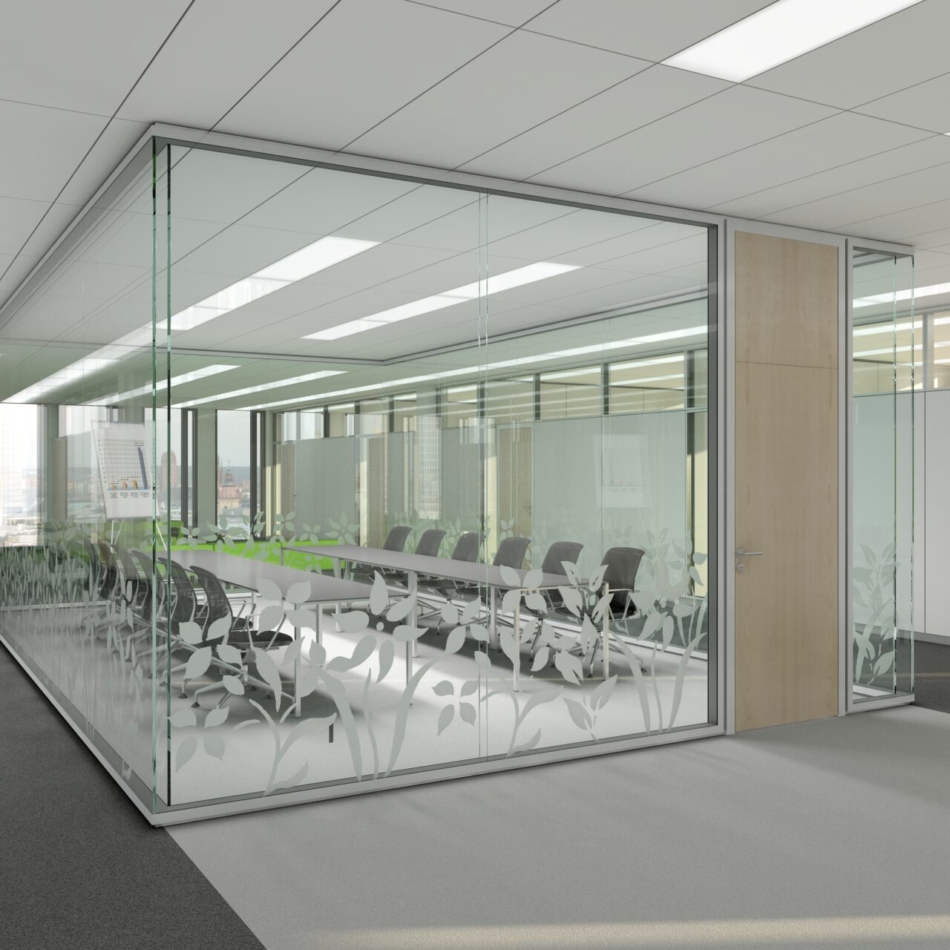 Vollverglaste Flurtrennwände in Büro- oder Konferenzräumen mit hoher bis sehr hoher Schalldämmanforderung im Objektausbau mit höchsten gestalterischen Ansprüchen.