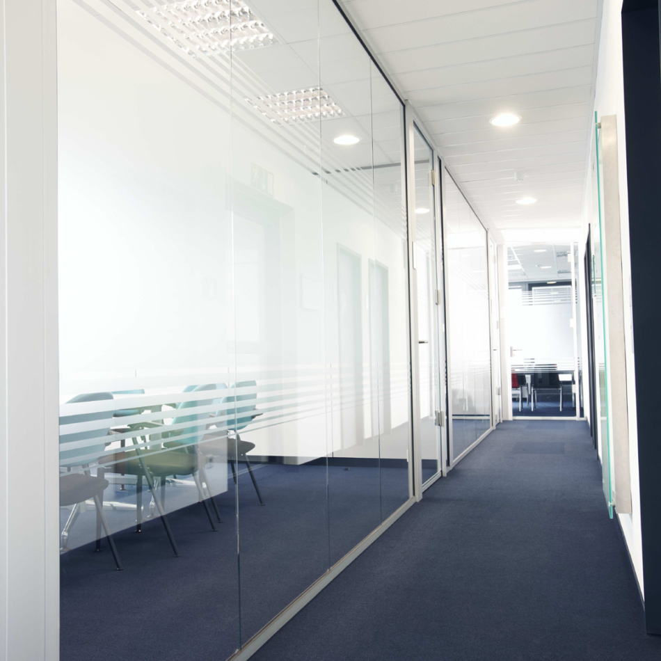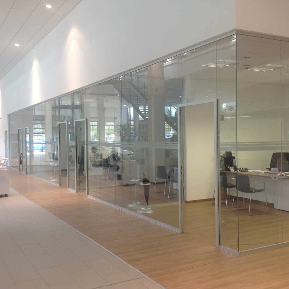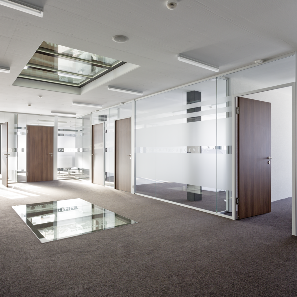 EINSATZBEREICHVollverglaste Flurtrennwände in Büro- oder Konferenzräumen mit normaler bis mittlerer Schalldämmanforderung.