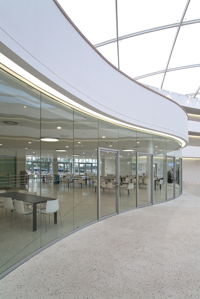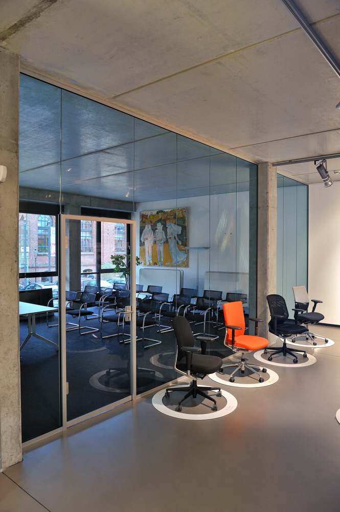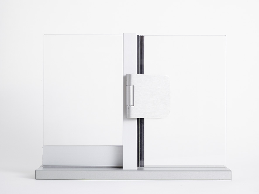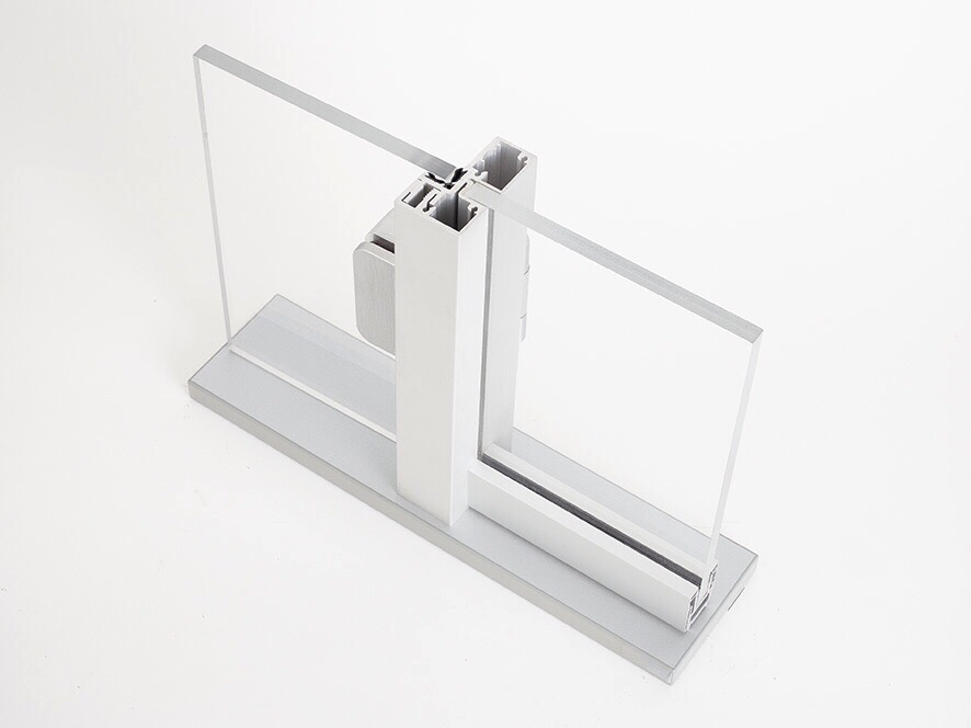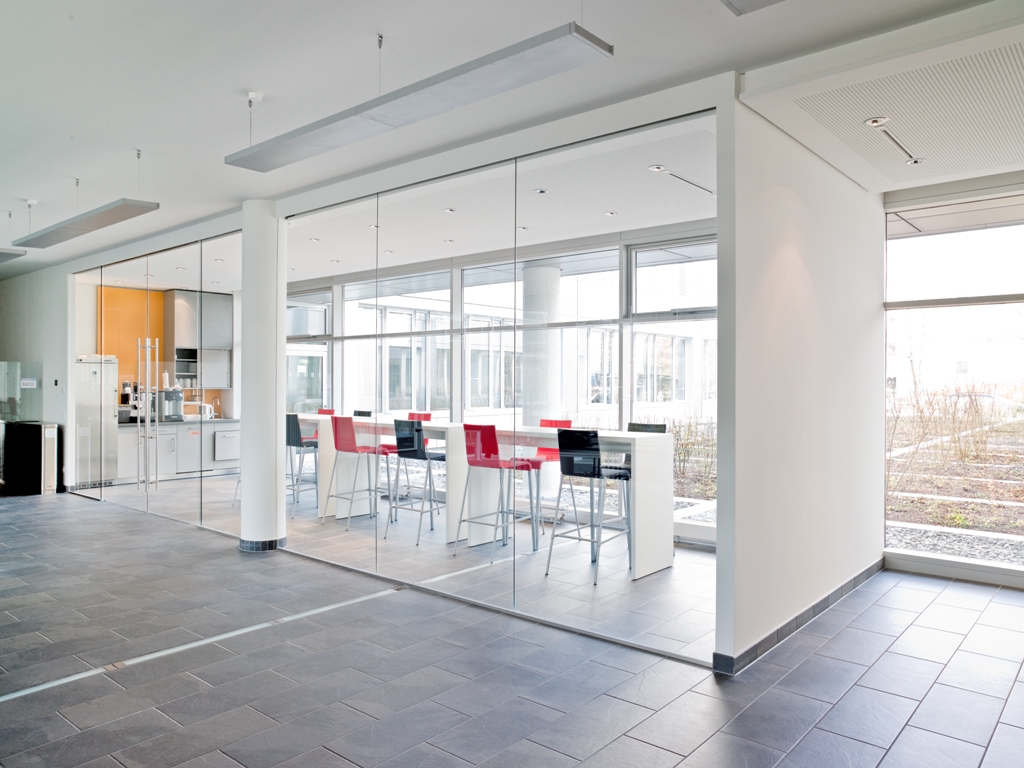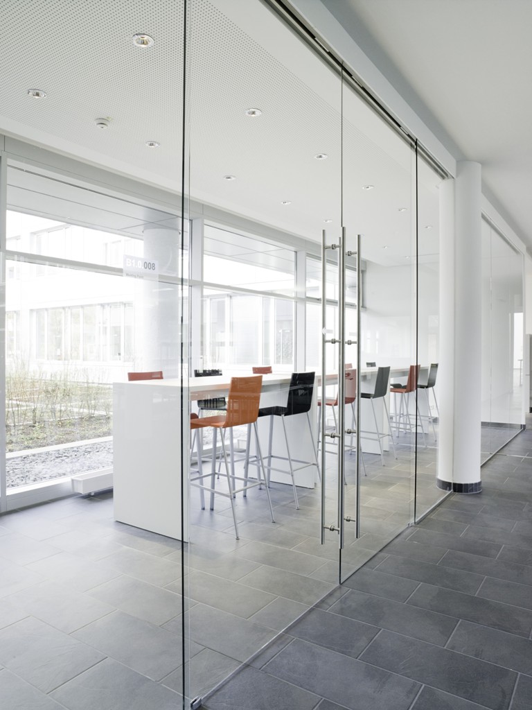 Das System 300 - Flurtrennwand bietet dank seiner schlanken Konstruktion mit Aluklemmprofilen maximale Stabilität bei gleichzeitig filigranem Erscheinungsbild. Die Türzarge wird freistehend in der Verglasung befestigt und kann alle Glasstärken von 10-19mm aufnehmen. Genauso ist die Befestigung des Schiebetürlaufbeschlages freihängend im Glas möglich. Durch die glasstärkenvariable Ausführung aller Profile können die für den hohen Schallschutz erforderlichen Dichtungen verdeckt eingebaut werden. Dadurch ist eine besonders homogene Gestaltung ohne störende Materialwechsel möglich.
